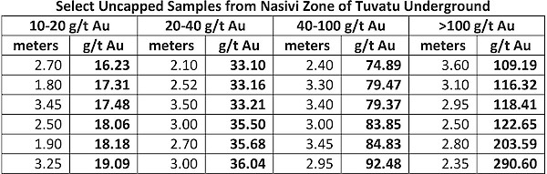 Tuvatu exhibits bonanza grades near surface, at depth, and on other prospects inside its mining lease.