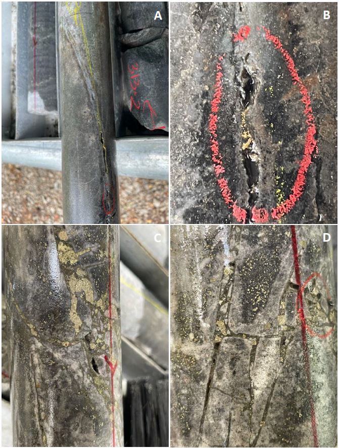 Figure 4. Photos of mineralization from TUG-150: A, B) 315.9m, 0.3m at 108.57 g/t Au, red circle indicates coarse VG; C) 318.9m, 0.3m at 28.51 g/t Au; D) 327.9m, 0.3m at 59.85 g/t Au. Red circle on the right indicates VG observed.