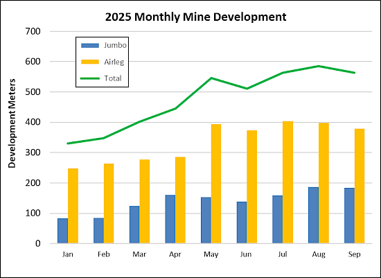 The Company has also increased overall development at Tuvatu by approximately 70% from January to September 2025. Overall development meters per month increased from 330.8 meters in January to 563.9 meters in September (Figure 1). This is a significant improvement as it enables the Company to accelerate the development of production stopes and workplaces underground. The Company expects that the increased development rates are sustainable and may be further improved upon with the arrival of additional mining equipment.