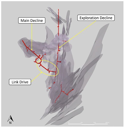 Figure 7. Location of link drive in relation to the main decline and the historical exploration decline. Mineralized lodes are shown in transparent grey. Connecting the main decline to the exploration decline enables the Stage 1 primary ventilation system to be installed and enables mining of the lodes accessed through the exploration decline.